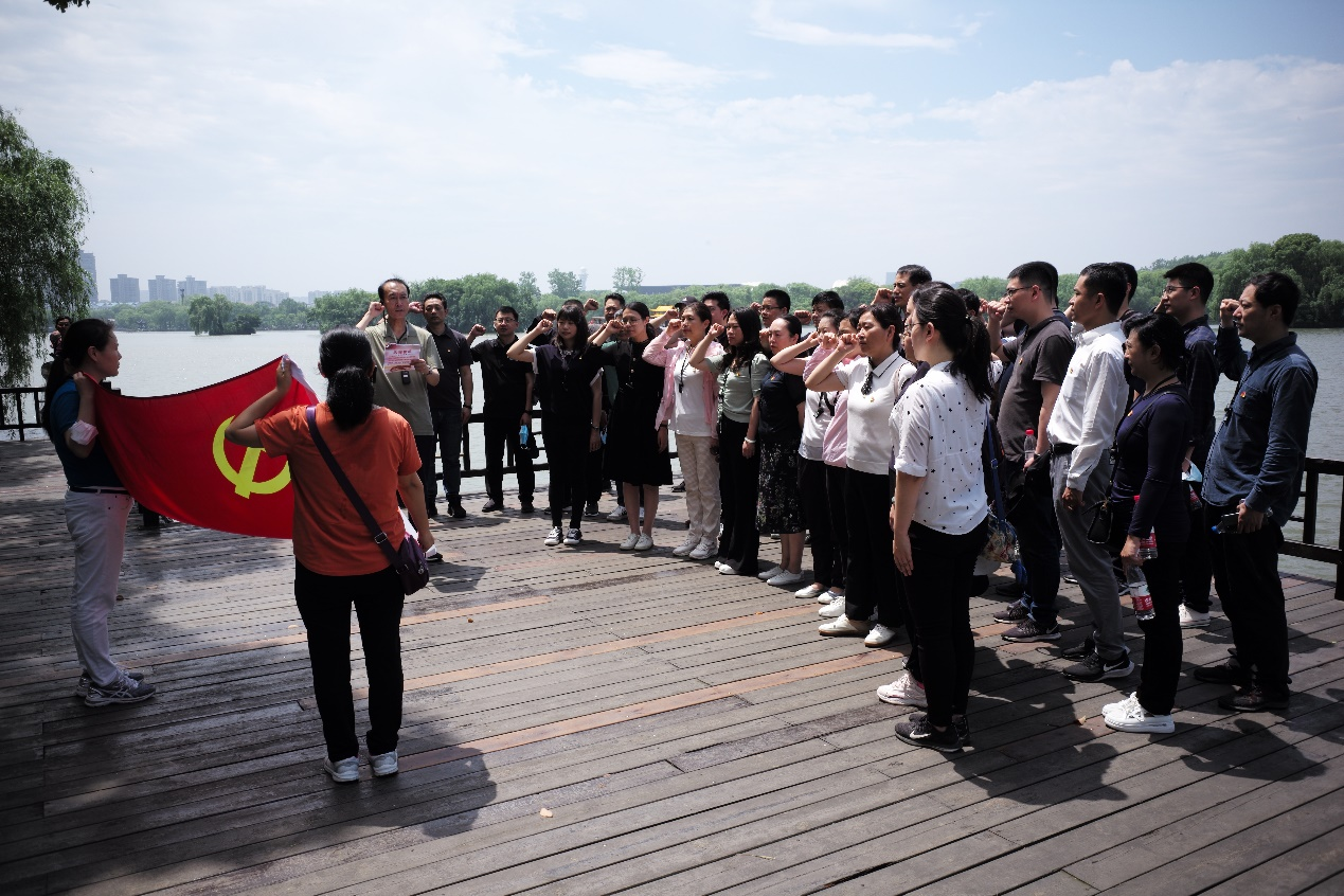 面對著南湖紅船和鮮艷的黨旗,在公司黨委副書記郄少杰領誓下,進行了新黨員入黨宣誓、老黨員重溫入黨誓詞,全體黨員高舉右拳,鏗鏘有力的宣誓聲響徹湖畔。